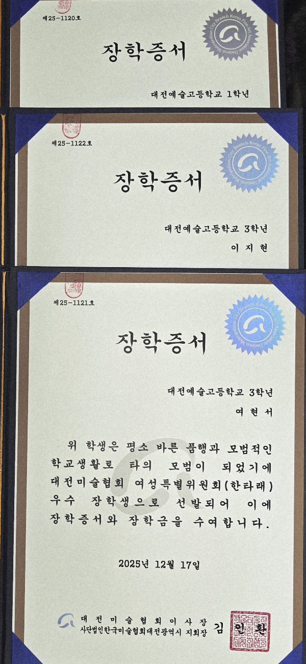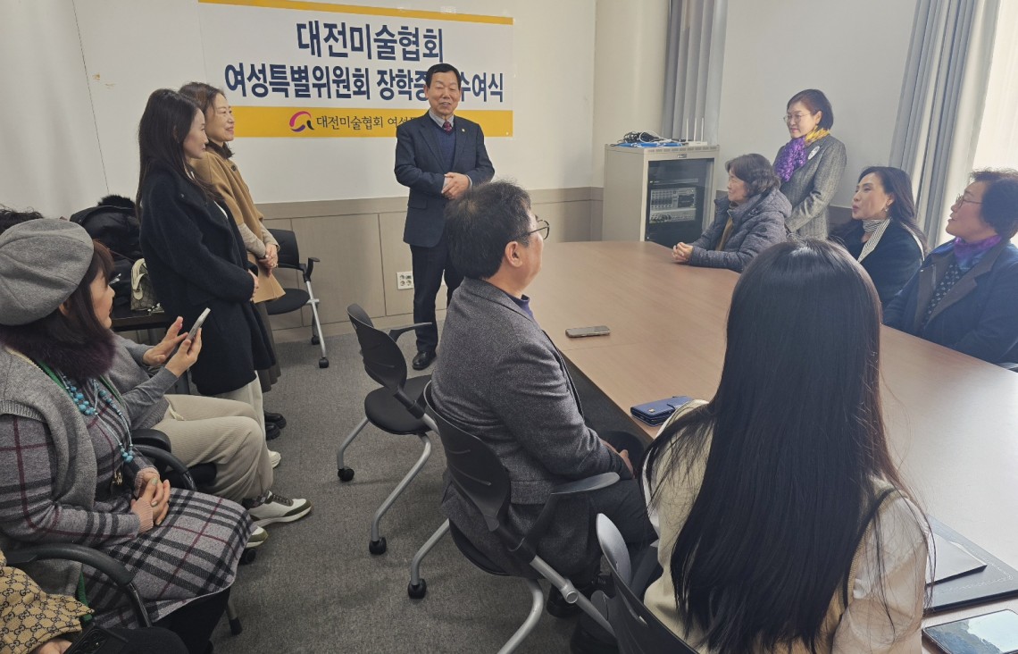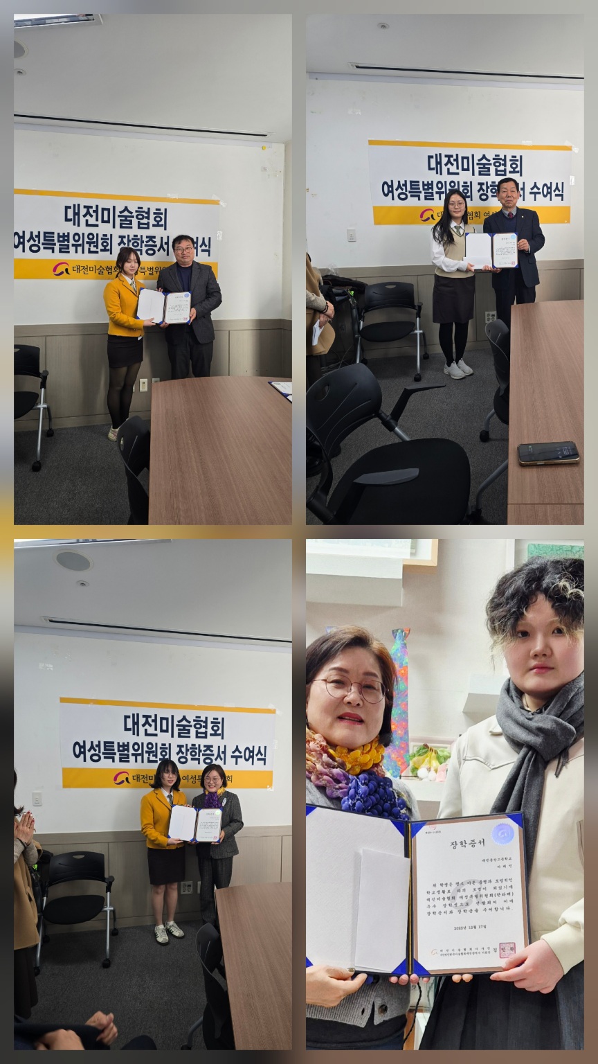 2025. 12. 17 장학기금 전달식 k진숙 0 9 12.22 08:33 2025년 장학기금 전달식이 예술가의 집 회의실에서 임원분들과 예총회장님, 대전미술협회회장님을 모시고 시행했습니다.
