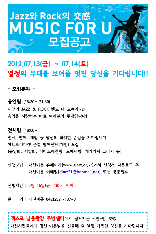 「MUSIC FOR U」 jazz와 Rock의 交感 참가팀 모집 [공연/전시] 관리자 0 5857 2012.06.12 14:47 2012.06.12 14:47 [전시]참가신청서2.hwp (0byte) + 187 많은 참여 부탁드립니다.