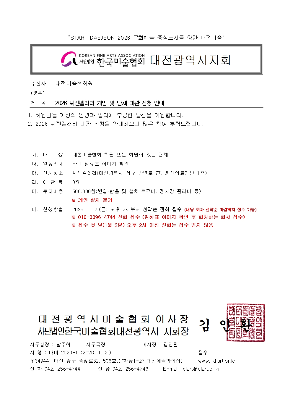 ■ 씨젠갤러리 개인 및 단체 대관 신청 안내 한국미술협회대전시지회 1 1329 01.02 13:39 「씨젠갤러리 개인 및 단체 대관 신청 안내」2026 씨젠갤러리 개인 및 단체 대관 신청 안내드립니다.아래 공문 이미지와 대관 일정표(회차)를 확인해 주시면 됩니다.많은 참여 부탁드립니다. 감사합니다.※ 접수가능시간: 월~금 (10:00~17:00 / 점심시간 12:00~13:00 제외) 「씨젠갤러리 대관 현황」2026. 1. 6. 기준기존 10회차, 11회차 일정 중복으로 인하여 11회차를 삭제하였으며,이에 따라 12회차 신청자부터는 회차 번호만 각 1회씩 앞당겨 조정하였습니다. (일정은 동일)