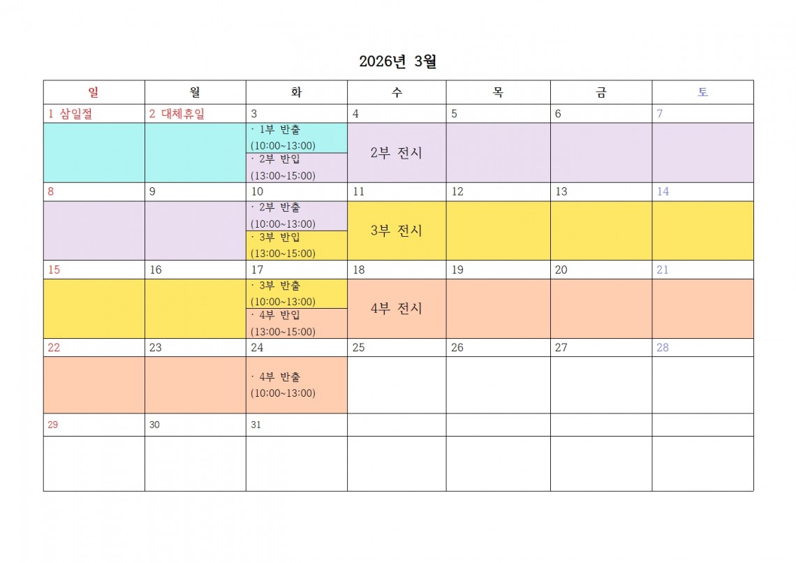 ㄴ 반입: 2026. 3. 10.(화) 13:00 ~ 15:00 / 반출: 2026. 3. 17.(화) 10:00 ~ 13:00 |